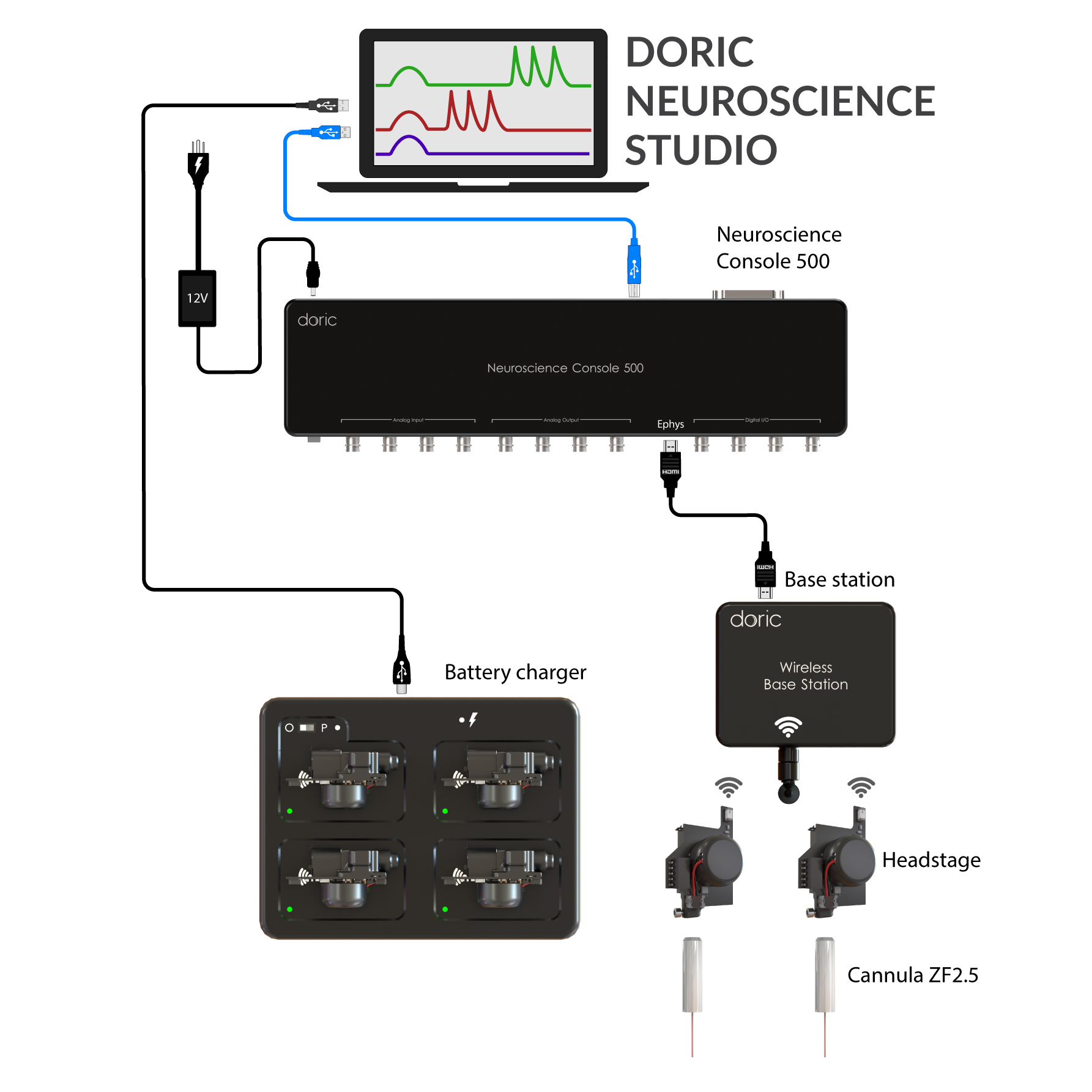 The system requires NC500 console and interfaces with Doric Neuroscience Studio. The Wireless Fiber Photometry system recording quality is comparable to signals recorded by Doric tethered systems.