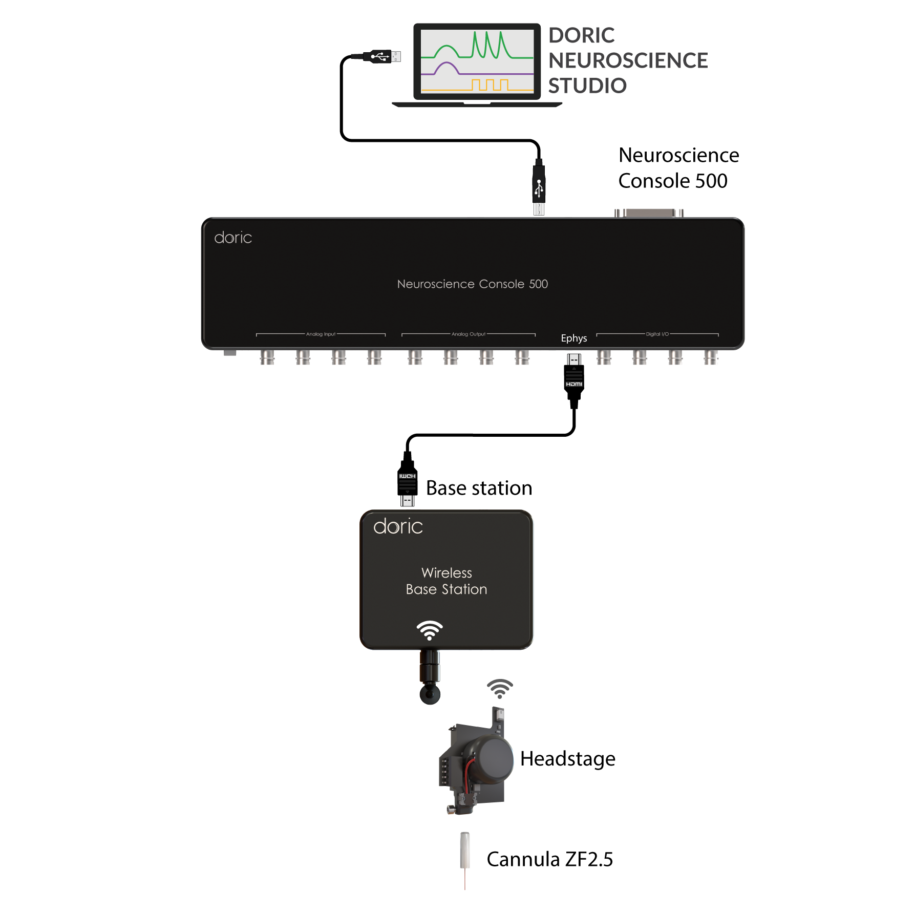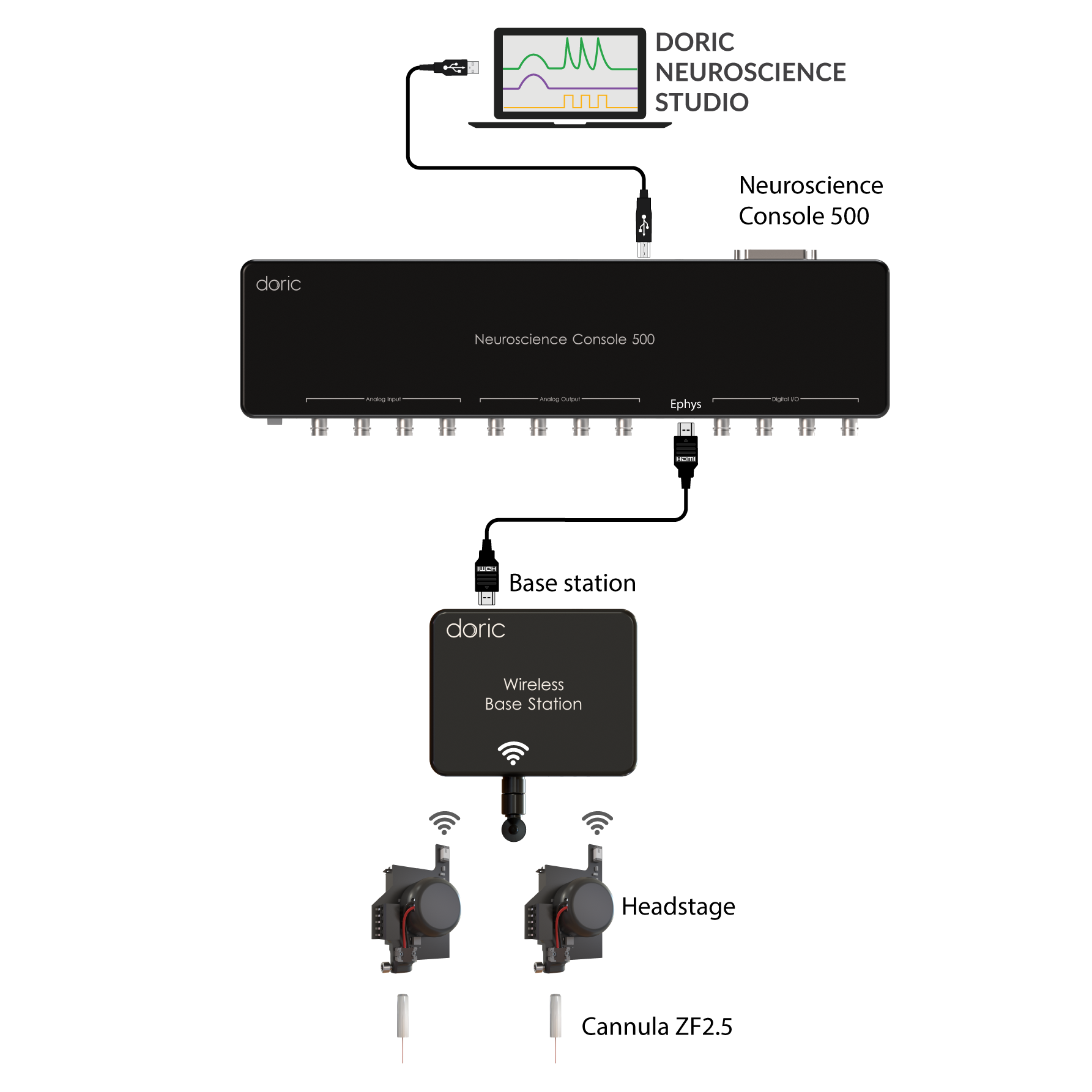 The system requires the NC500 console (or BBC300 console, but with limited number of headstages), at least one base station and one wireless headstage. It comes free with the Doric Neuroscience Studio data acquisition software. The Wireless Fiber Photometry system recording quality is comparable to signals recorded by Doric tethered systems.