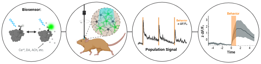 Unlike Doric Miniscopes, which resolve single-cell activity, fiber photometry records population signals (i.e bulk fluorescence from labelled neurons). But unlike microscopy, fiber photometry is minimally invasive, optimized for multi-animal & multi-site experiments, and more cost-effective.