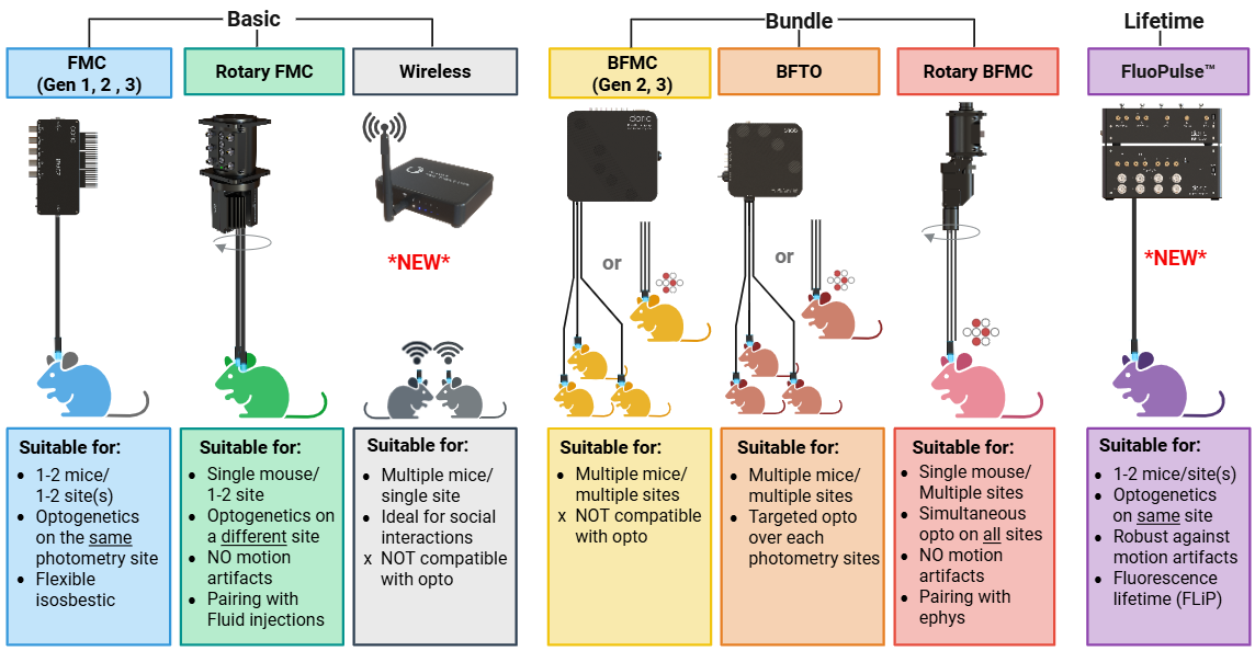 The Bundle Photometry System includes 3 subcategories including the Bundle Fiber Photometry System (BFMC), Bundle Fiber Photometry with Targeted Optogenetic (BFTO) and the Rotary Bundle Fiber Photometry (RBFMC) (see image below).