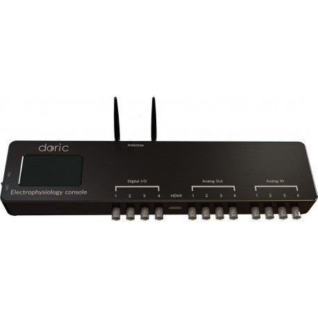 This FPGA-based console supports two-way communication between the computer and the tethered ephys headstages or fiber photometry system. At the beginning of the experiment, the console sets the recording parameters and the fiber photometry excitation sequence in the Doric Neuroscience Studio (DNS) software. The recording or light delivery can also be triggered by external sources as touch sensor or tracking software, etc. The Electrophysiology and Fiber Photometry Console handle one tethered headstage HS-T16 that record 4 electrodes at 25 kHz, 8 electrodes at 20 kHz, or 16 electrodes at 10 kHz. Additionally, it support multiple fiber photometry recordings using lockin amplifier or time-interleaving detection. Data can be displayed, commented, saved, and pre-analysed with DNS software.